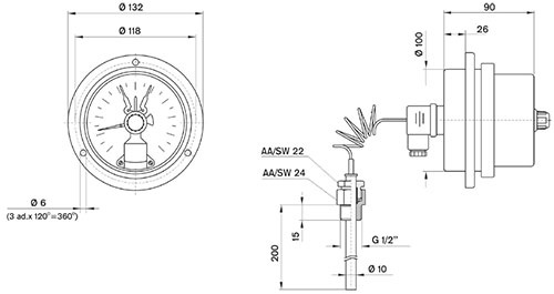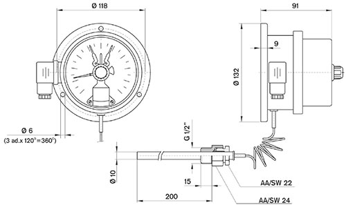 قطر صفحه 10 سانتیمتر – رنج کاری از منفی 30 تا مثبت 300 درجه سانتیگراد – بدنه استیل – اتصال ½” – دو کنتاکنت – طول سنسور 2 متر